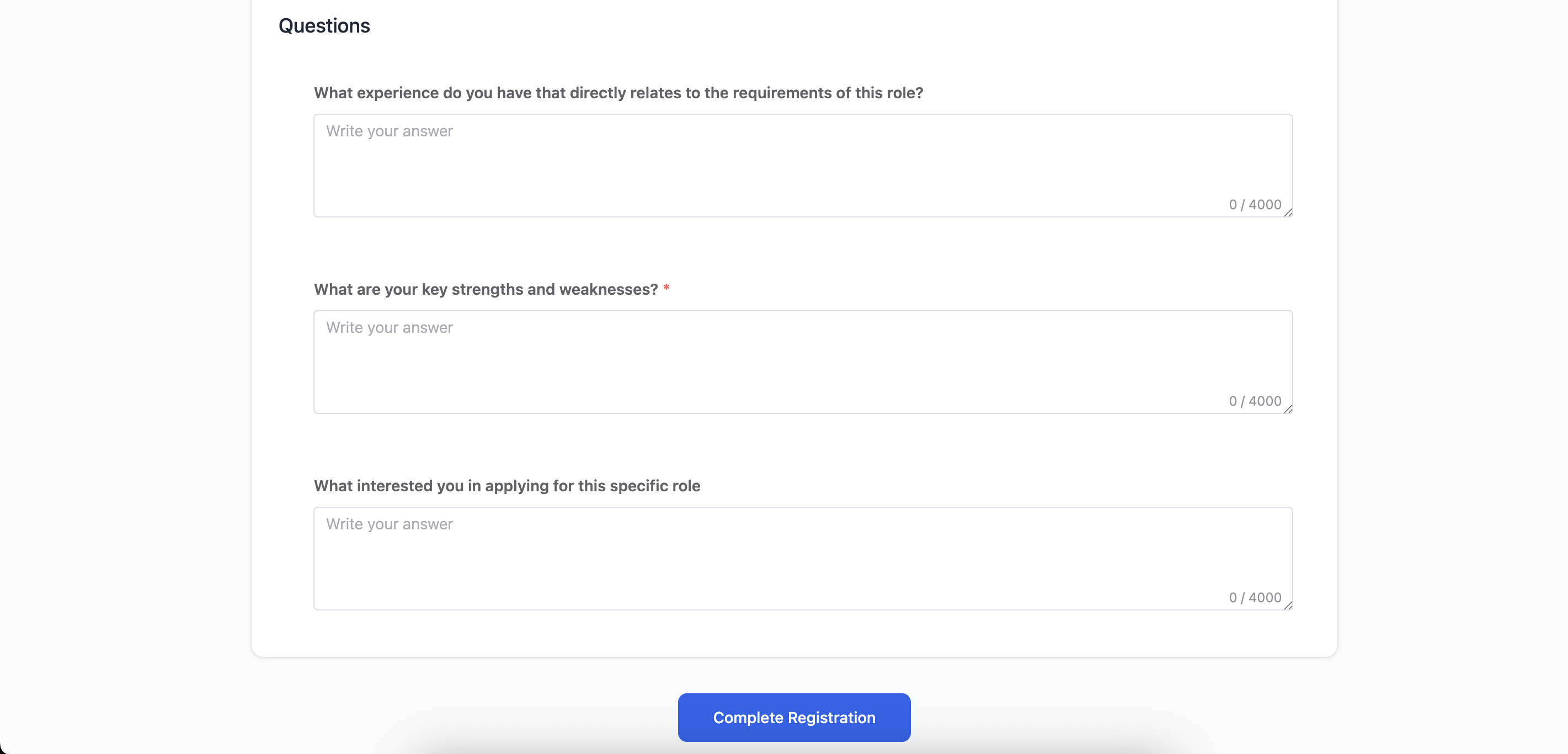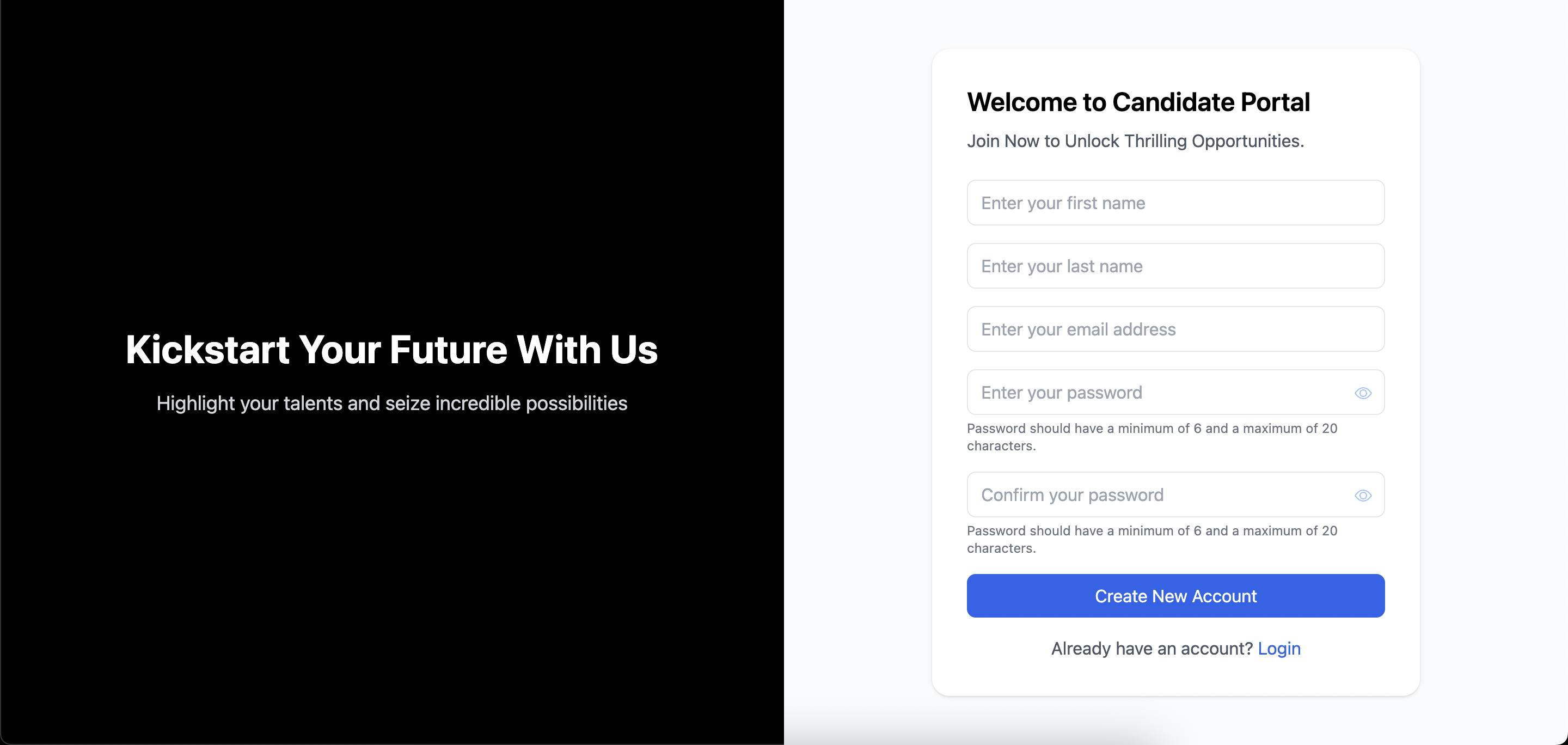 Upon registration, candidates are prompted to complete an Onboarding Form to provide key details for their profile.