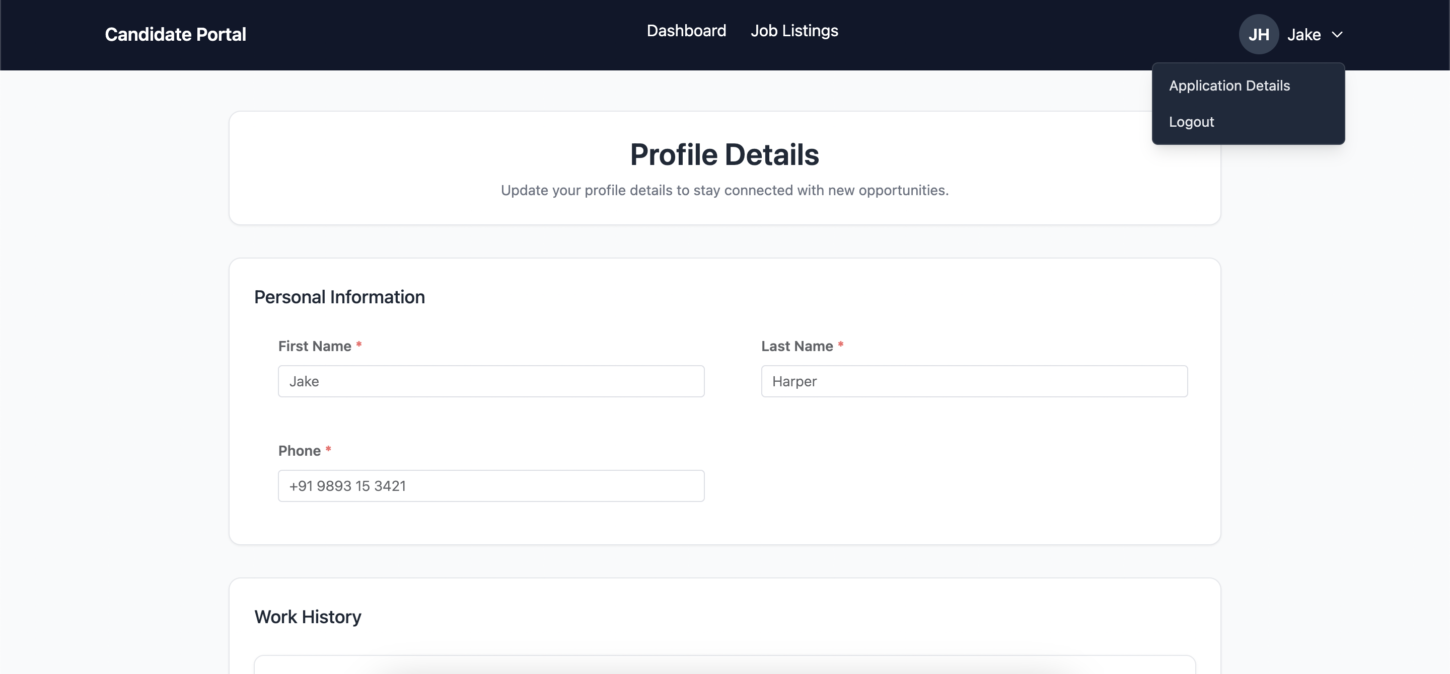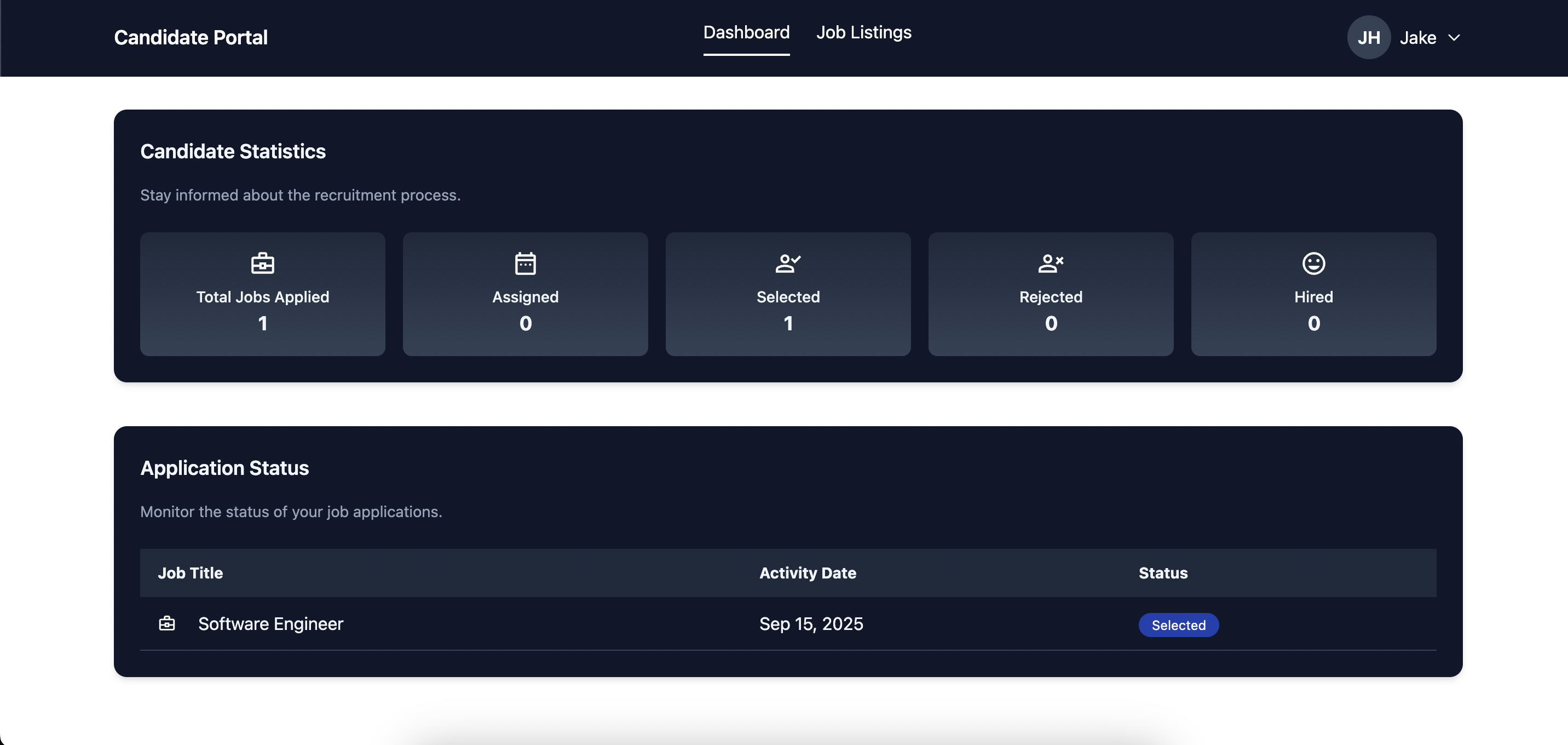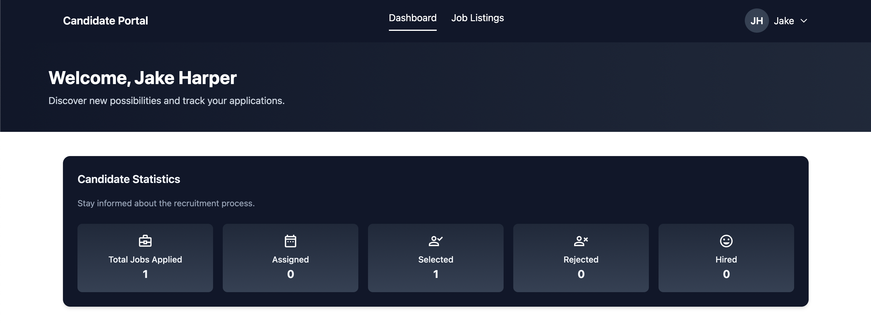 The Candidate Dashboard is the central hub where candidates manage their job applications and profiles. It includes: