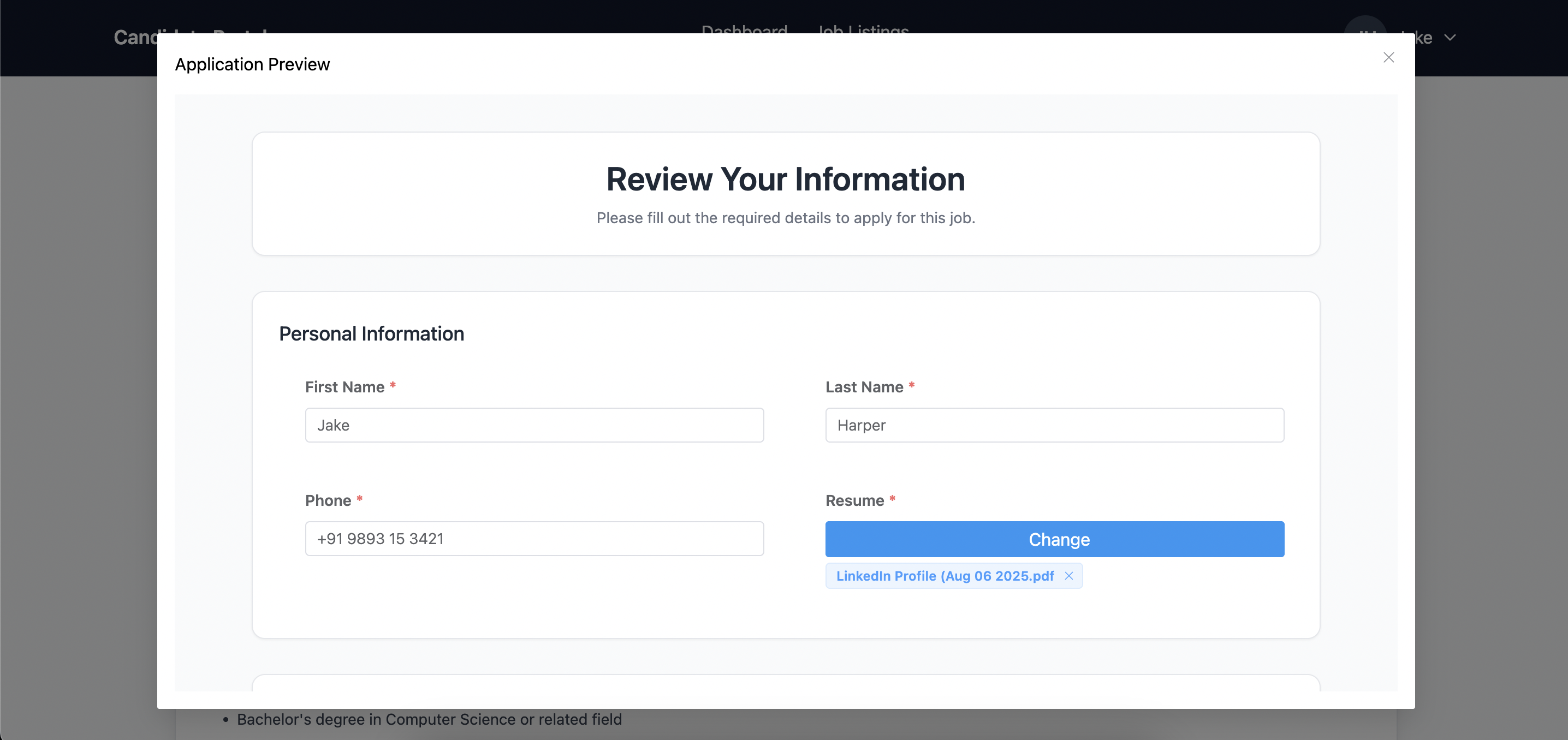 Candidate details (e.g., name, contact info, resume) are pre-filled from Profile records.