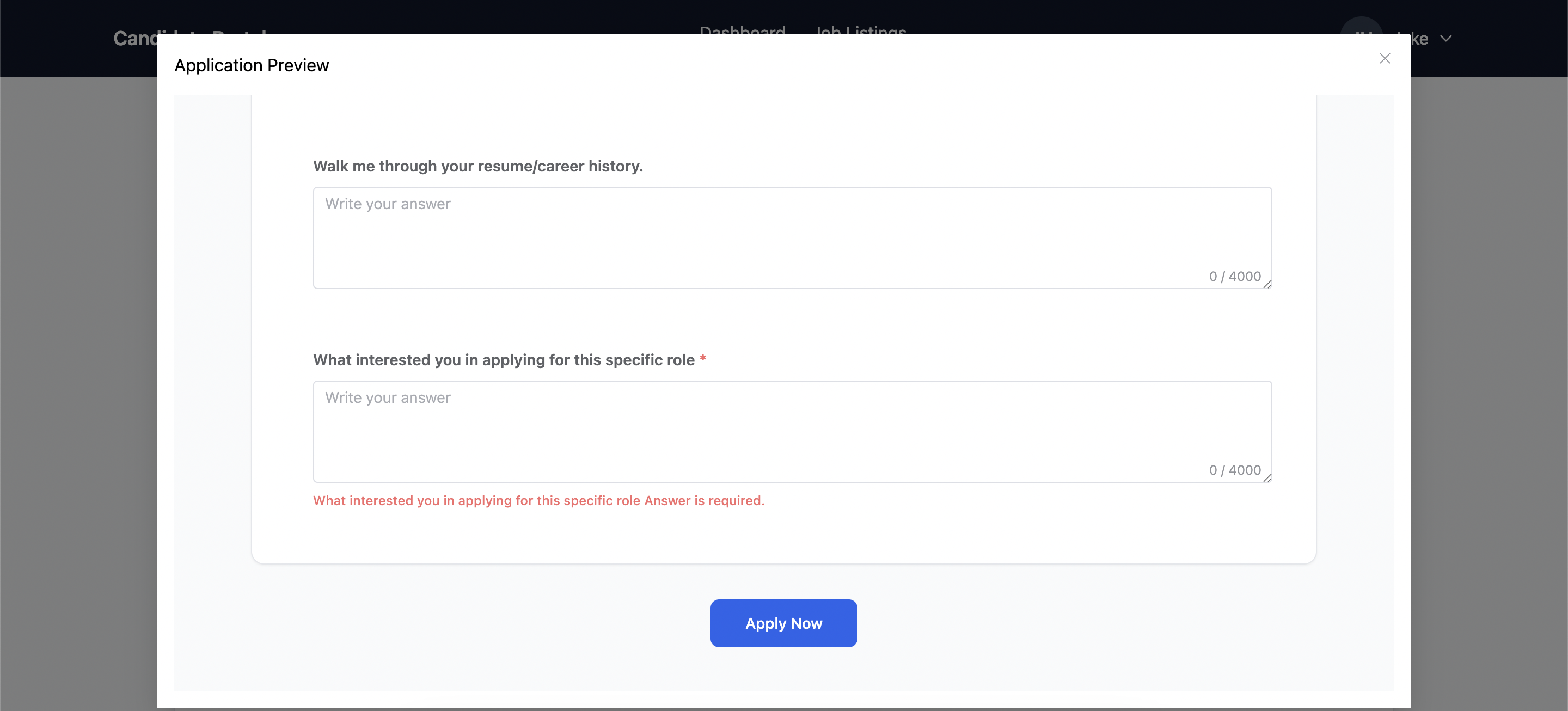 Step 1: Candidates complete any missing fields specific to the job’s application form. Pre-existing profile data is automatically populated.