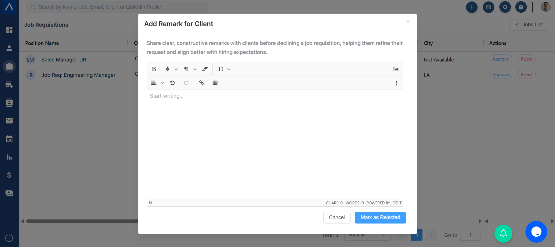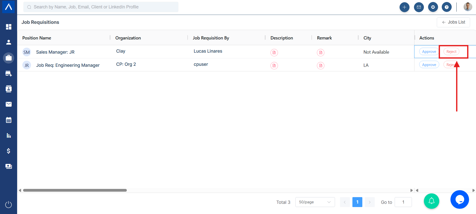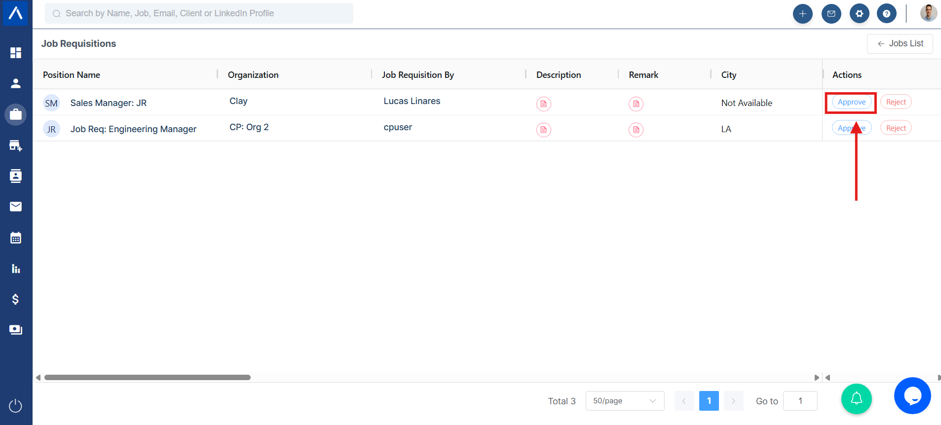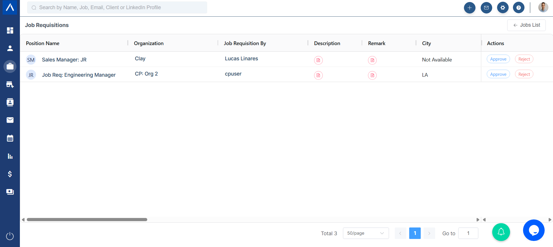 Job requisitions are submitted by clients through the Client Portal. As a recruiter or account user in ATZ CRM, you can review, approve, or reject these requisitions directly from the system.