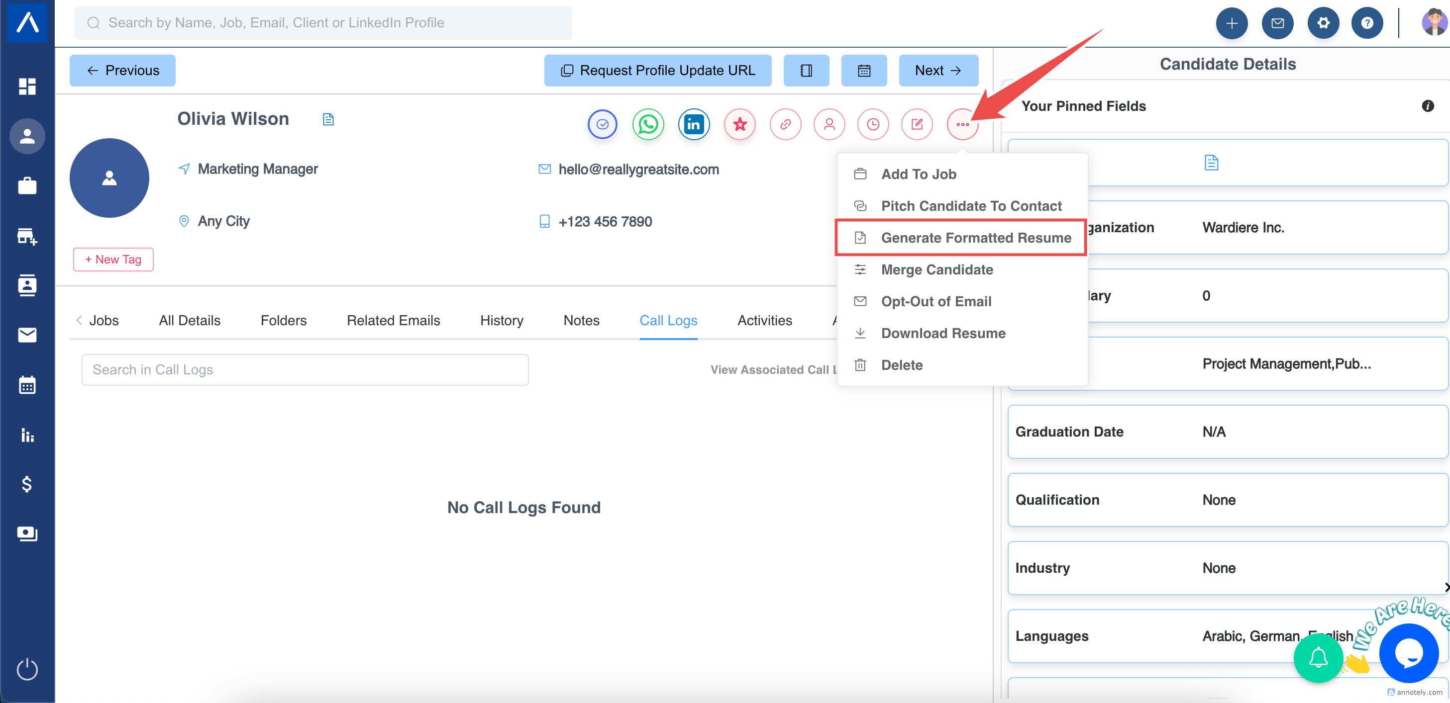 Go to the candidate profile, click the three dots (⋮) in the top-right corner, and select “Generate Formatted Resume.”
