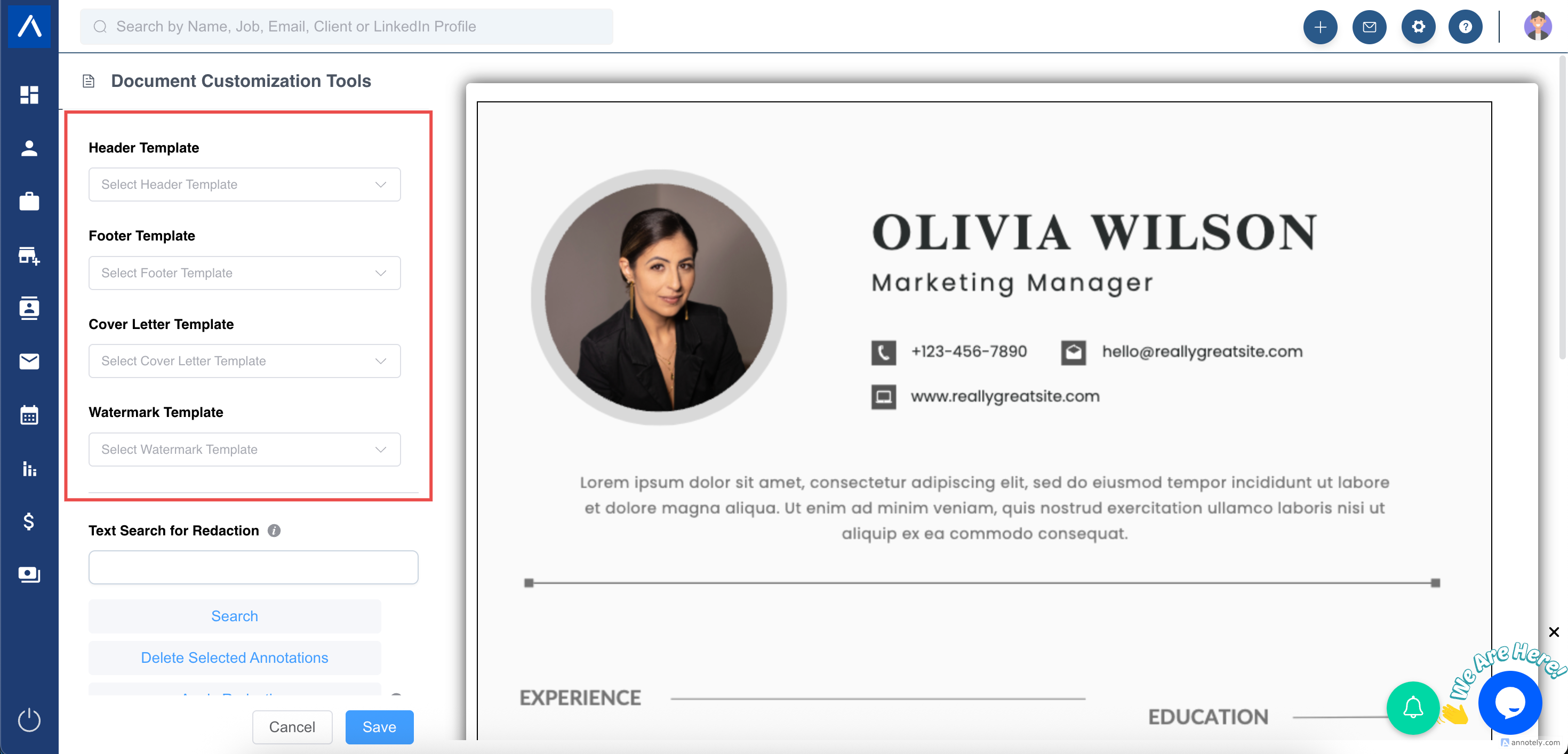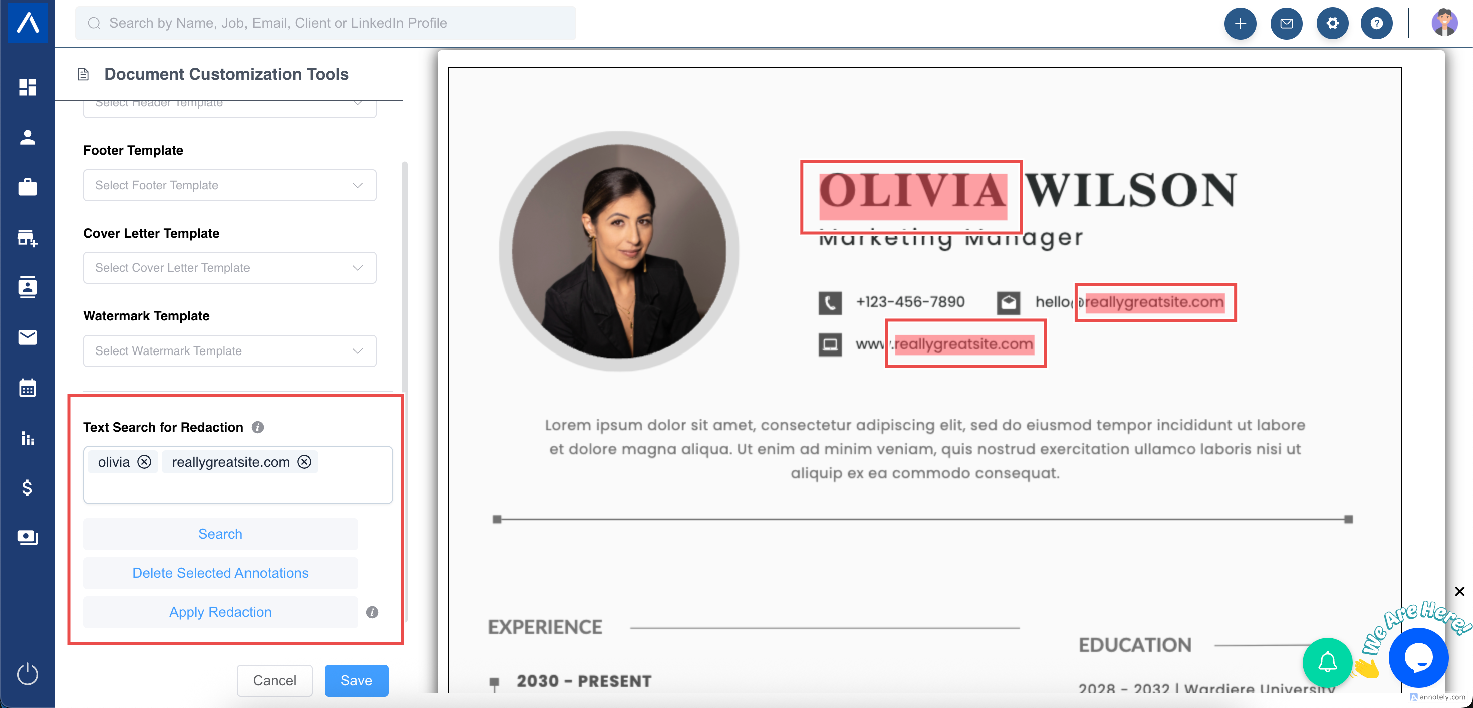 Note: The Resume/CV Formatting feature, including Text Redaction and custom templates, is available on the Business Plan and above.