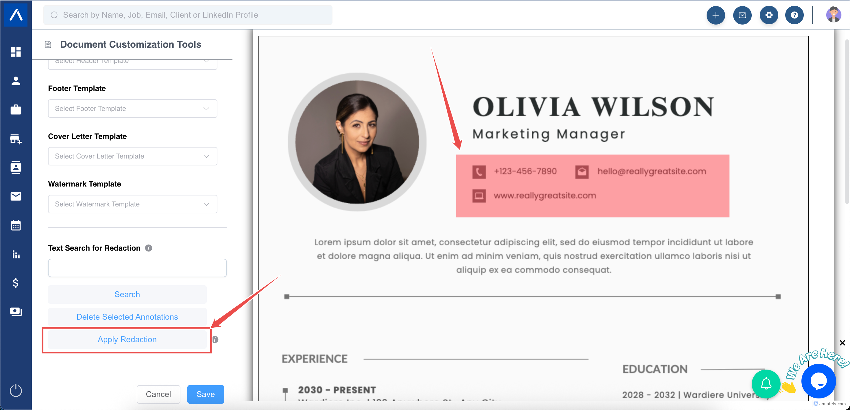 The Text Redaction feature lets you hide any information you don’t want clients to see — such as candidate names, emails, phone numbers, or addresses.