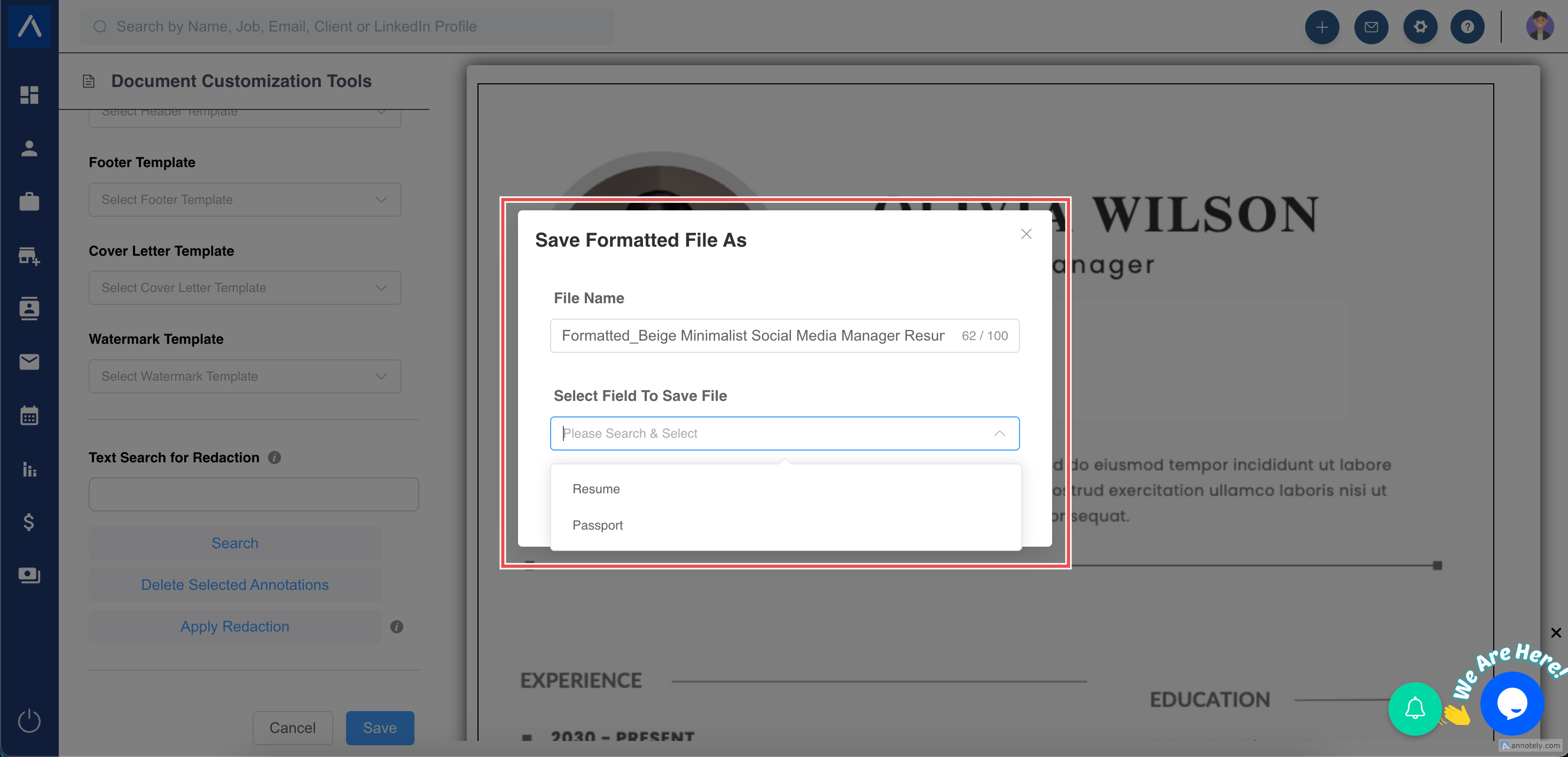 If you’ve created a file-type custom field under Candidate Fields, you can choose to save the formatted CV there.