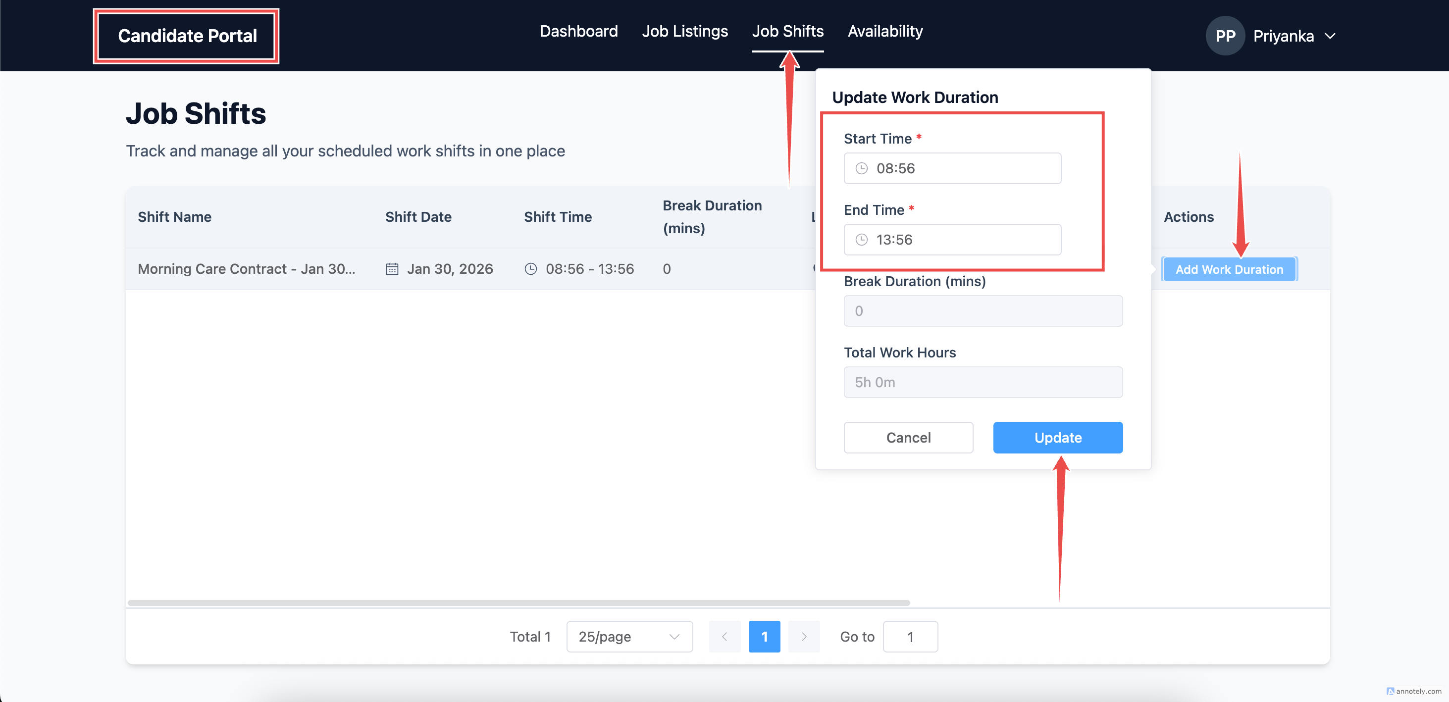 The workflow follows the way temp agencies already operate — just without paper, spreadsheets, or WhatsApp messages.