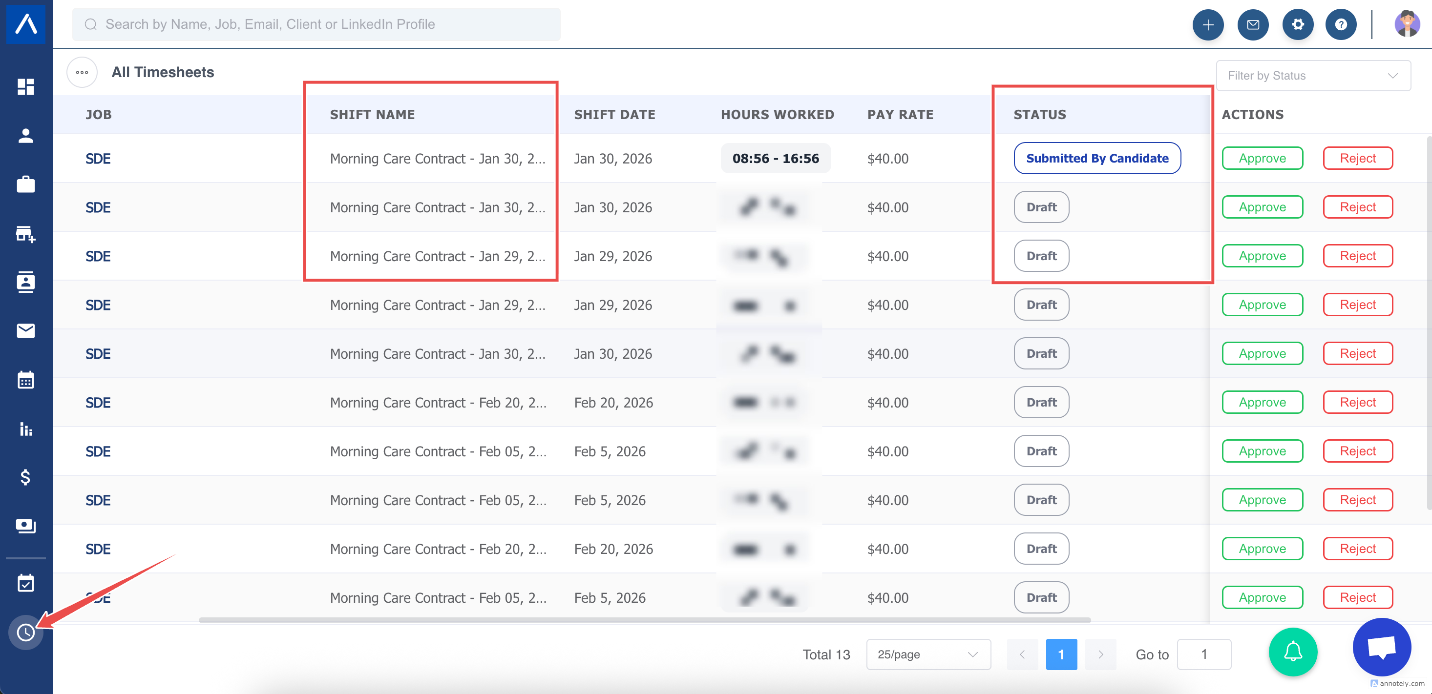 Once completed, ATZ CRM automatically creates a Draft Timesheet for each candidate.